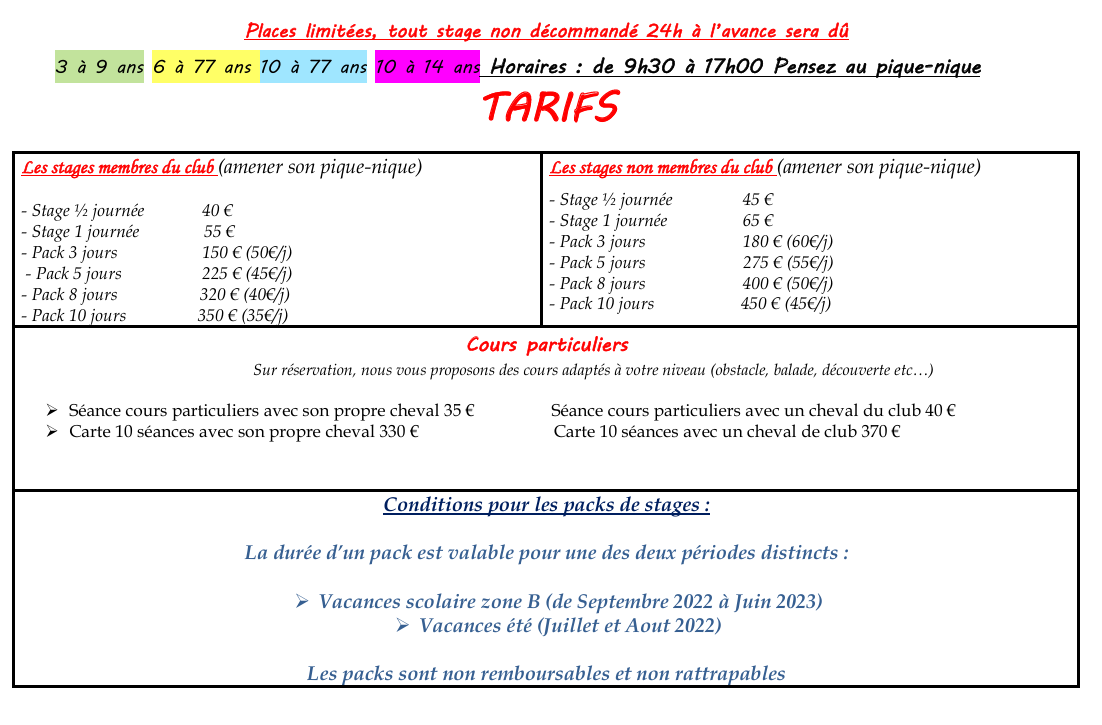 - Stages ( balades, perfectionnement, examens, travail à pieds etc...)